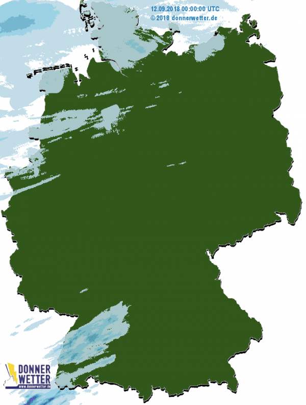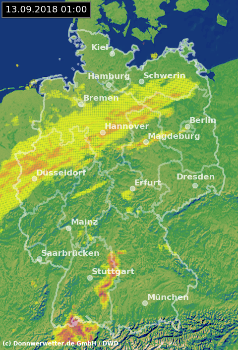 Das Radarbild zeigt aktuell die von Belgien, über NRW bis ins südliche Mecklenburg-Vorpommern reichende Zone mit leichten Regensignalen, die zu der Kaltfront gehört, welche langsam nach Südosten voran kommt. Im Vorfeld der Kaltfront ziehen örtliche Schauer- und Gewitterherde aus der Schweiz heraus nach Baden-Württemberg und Bayern. Sonst präsentiert sich der Himmel über Deutschland teils wolkenverhangen, teils sternenklar oder nur leicht bewölkt. Insbesondere auf den Gipfeln der Mittelgebirge haben sich einige Nebelfelder gebildet.