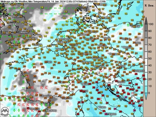 Die GFS-Wetterkarte für den 14. Juni (12:00 Uhr):