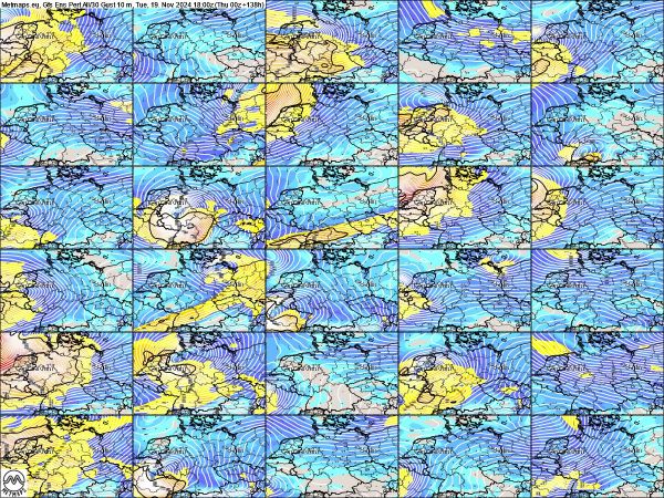 Die aktuellen Ensemble-Karten (00:00-Uhr-Lauf) des US-amerikanischen GFS-Modells für den Dienstagnachmittag (19.11.) sind sich da noch nicht so ganz sicher.