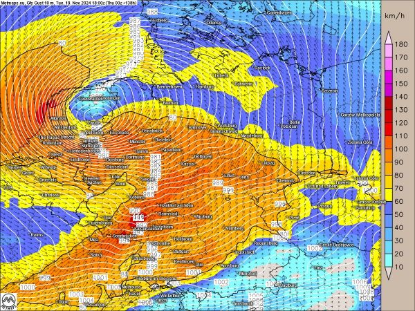In der großen Karte für den 19.11. (18:00 Uhr) prognostiziert das GFS-Modell aktuell Windböen mit dem Sturmfeld über Deutschland. Und die anderen Wettermodelle? Die gehen zur Zeit zumindet von etwas harmloseren Verläufen aus.