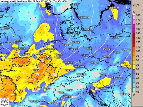 Die Karte für 15:00 Uhr zeigt schön, wie das System aus Belgien/Frankreich Deutschland erreicht: