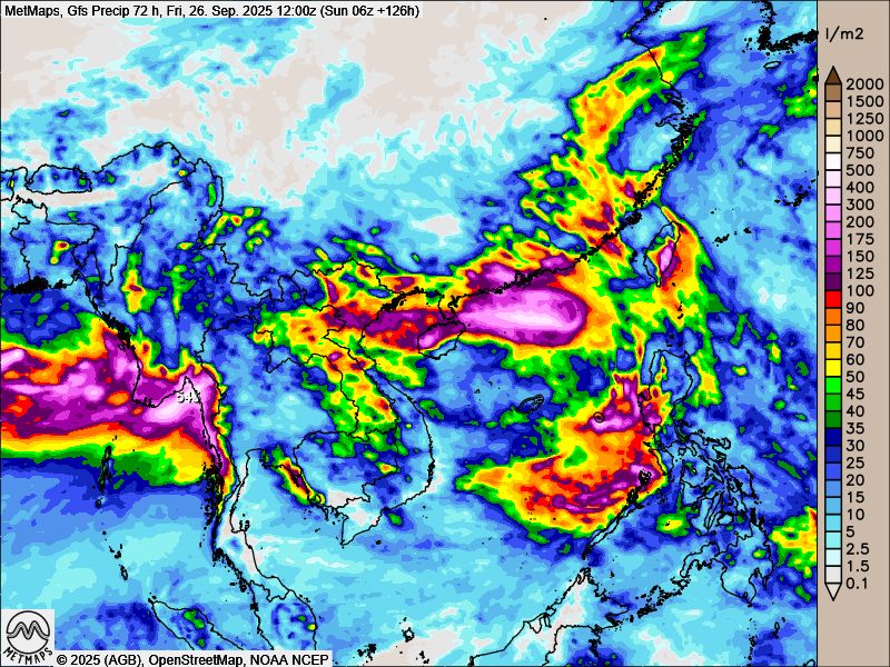 Hier die Verlaufskarte des JOINT-typhoon-centre und die 72-Stunden-Regenmengen bis Freitag nach GFS.
