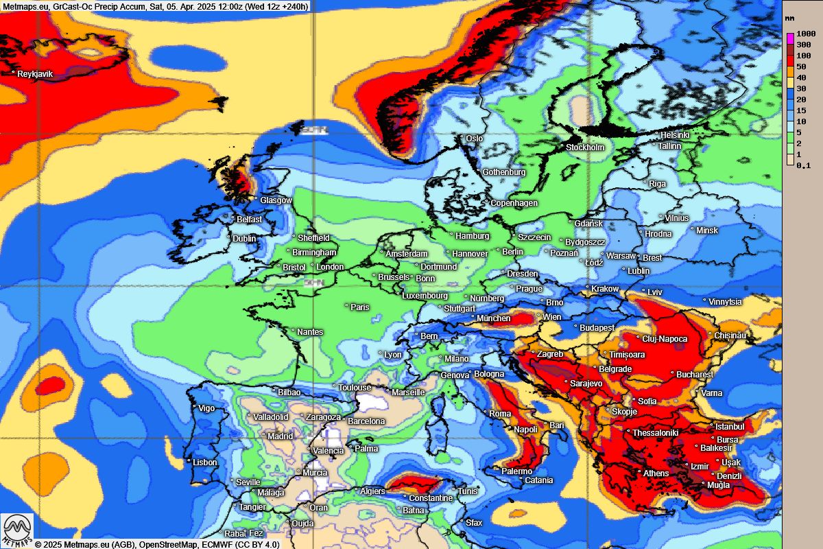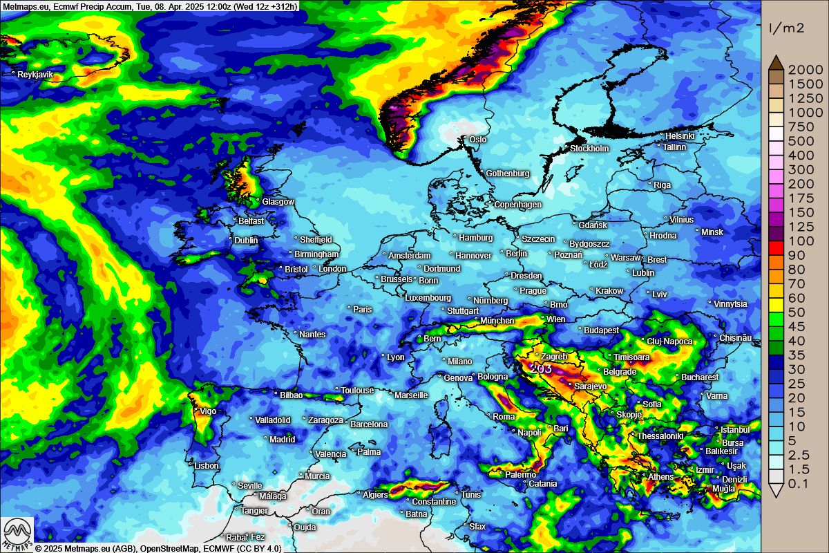 Nachfolgend die Google-Graphcast-Niederschlagsprognose sowie die bis weit in den April reichende ECMWF-Niederschlagsprognose.