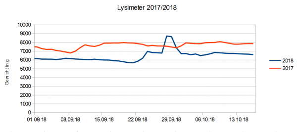 Die folgende Grafik zeigt vergleichend die Auswertung unseres Lysimeters / Wasserbilanz in den Jahren 2017 und 2018. Aus beiden Jahren dargestellt ist der Zeitraum 01.09. - 16.10., die Daten stammen von unserer Wetterstation in Bonn.