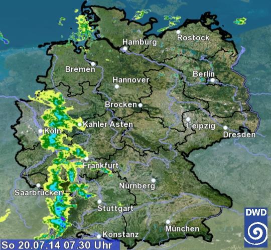 Es wird wieder ein heißer Tag, fast überall in Deutschland, aber Schauer und Gewitter sind heute häufiger unterwegs, besonders im Westen. Zum Frühstück sind sie schon am Rhein.