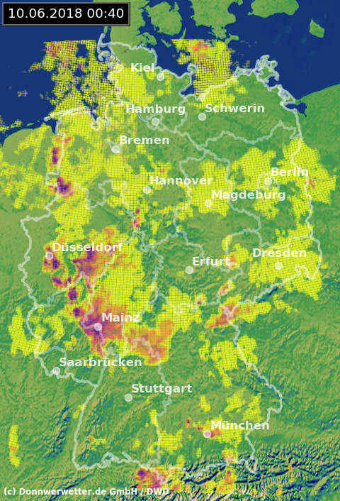 Das Radarbild zeigt aktuell vor allem am Mittelrhein und an der holländischen Grenze zum Teil kräftige Schauer und Gewittersignale, die langsam nach Norden wandern. Sonst sind die meisten schweren Gewitter in sich zusammen gefallen. Der Himmel über Deutschland präsentiert sich teils wolkenverhangen, teils aufgeklart. Vereinzelt haben sich im Südwesten Nebelfelder gebildet.