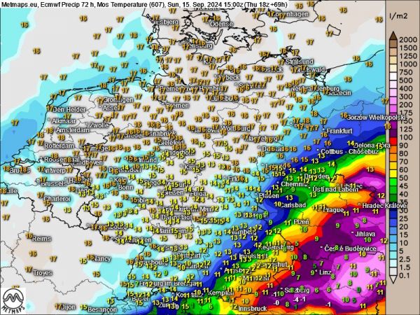 Die Karte zeigt die nach ECMWF berechneten Temperaturen für Sonntagnachmittag sowie die 72-Stunden-Niederschlagssummen.
