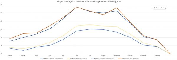 Im Jahr 2023 lagen die Höchsttemperaturen zwar nur um wenige Zehntel Grad über denen des Rheintals; allerdings war es im Weinberg in den Nächten um fast 2 Grad  wärmer als "unten".