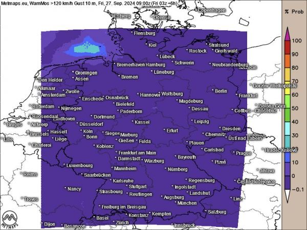 Im WarnMOS wird die Wahrscheinlichkeit, dass an der Nordseeküste Windgeschwindigkeiten über 120 km/h auftreten, auf 30 Prozent angesetzt: