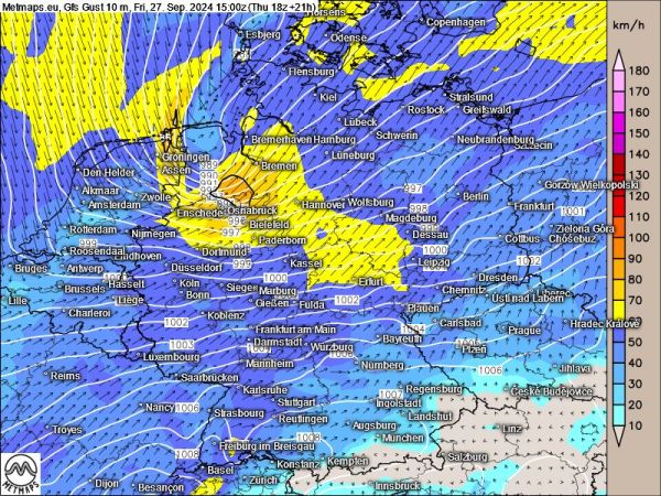 Die meisten Wettermodelle sehen das kleine Sturmtief am heutigen Freitag nun überwiegend über die Nordsee und die Inseln hinwegziehend. Hier sind heute Windgeschwindigkeiten von 120 km/h und mehr möglich. Das US-amerikanische GFS-Modell verlagert das Hauptfeld mehr nach Süden (siehe Karten).