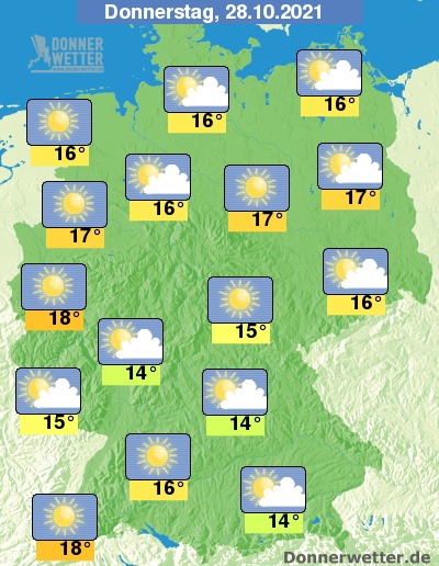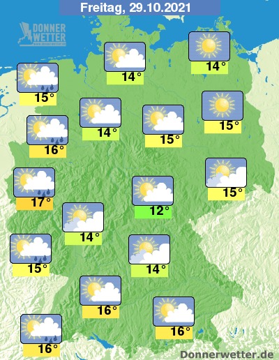 Bei einem freundlichen und meist trockenen Sonnen-Wolken-Mix klettern die Temperaturen am Donnerstag und Freitag nochmals auf Höchstwerte meist um 14 bis 17 Grad. Im Rheinland und am Oberrhein sind sogar Wohlfühlwerte um 18 Grad möglich.