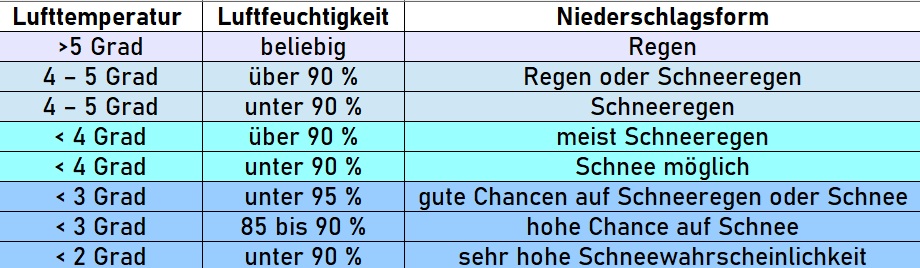 Tabelle: Temperatur, Luftfeuchtigkeit & wahrscheinliche Niederschlagsart