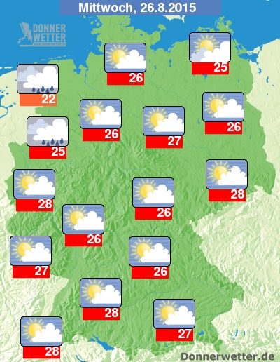 Am Donnerstag hält sich das Wetter weiterhin in der Südhälfte Duetschlands heiter, teilweise auch sonnig. Die Regionen Berlin und Sachsen zeigen ebenfalls einen heißen tag an. An der Ostseeküste und im Ostfriesland sind mit Regenschauern zu rechnen. An der Nordseeküste zeigt sich der Himmel and er Weser entlang bedeckt.