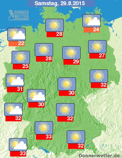 Der Sonntag zeigt sich im Norden sonnig mit Temperaturen zwischen 22 Grad C und 33 Grad C. Im Äußersten Norden sind nach der sonnigen Woche wieder mit Gewttern zu rechnen. Die Südhälfte Deutschlands zeigt sich wierhin sehr heiß mit Temperaturen die bis auf 35 Grad C steigen.