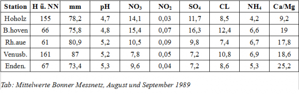 Nicht festgestellt werden konnte damals, dass die Immissionsbelastung jahreszeitlichen Schwankungen unterliegt. Dafür aber, dass die pH-Werte an den Messstationen östlich des Rheins (Hoholz, Bechlinghoven) niedriger waren als an den Stationen westlich des Rheins (Rheinaue, Endenich, Venusberg). Im Osten lag die Säurestärke im Mittel bei 4,7 bis 4,8, im Westen bei 5,2 bis 5,3.