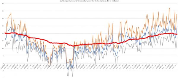 Was die Daten zeigen: In den sehr warmen Sommermonaten orientiert sich die Temperatur unterhalb der Bodenplatte grob an den Tagesmittelwerten der Lufttemperatur. Selbst bei Lufttemperaturen jenseits der 35 Grad heizt sich der Boden nicht auf Werte über 25 Grad auf, die Spitzenwerte lagen im fünfjährigen Beobachtungszeitraum bei 22 bis 23 Grad.