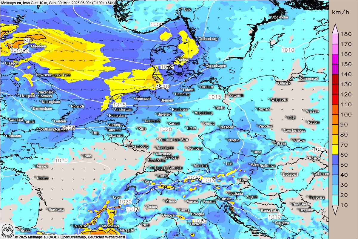 10-m-Windböen am Sonntag, 06:00 Uhr, in km/h