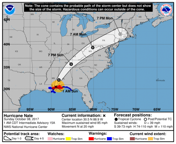 Nach Katrina 2005 hat Nate nun die US-Küste erreicht und wird nun Sturm und Regen bringen. Bis Dienstag zieht er entlang der Ostküste durch die USA. Er bleibt bis Dienstag mit Starkregen eine Bedrohung für bis zu 25 Mio. Menschen.
