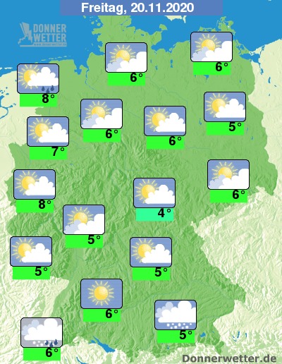 Der Freitag hat dann insgesamt zwar wieder deutlich mehr freundliche und trockene Phasen mit im Gepäck, die Tageshöchstwerte erhalten aber nochmals einen Dämpfer. Zweistellige Plusgrade sind Geschichte, die Temperaturen pendeln sich am Nachmittag bundesweit bei Werten um 6 bis 8 Grad ein.