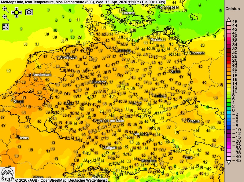 Höchsttemperaturen am Mittwoch um 14 bis 19 Grad.