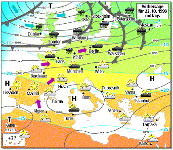 Liegt beispielsweise ein Tiefdruckgebiet genau über den Britischen Inseln und liegt hoher Luftdruck über Polen, dann lässt sich aus der Wetterlagenbescheibung erkennen, dass warme Luft nach Mitteleuropa geführt und kalte Luft über den Atlantik nach Süden geführt wird.