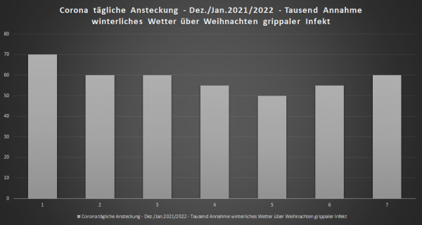 Das Modell stellt die durchschnittlichen täglichen Corona-Neuinfektionen bis Januar 2022 wochenweise dar. Ausgangspunkt ist der 02.12.2021 / Beginn Woche 1.