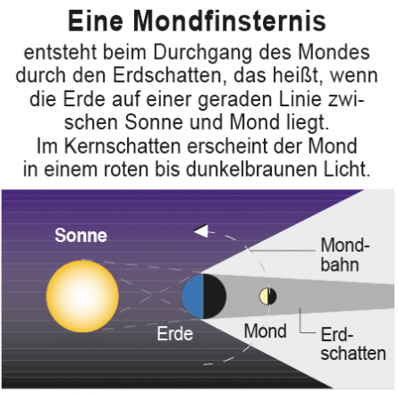 Zu einer Mondfinsternis kommt es immer dann, wenn die Erde genau zwischen Mond und Sonne steht, daher ist eine Mondfinsternis nur bei Vollmond möglich.